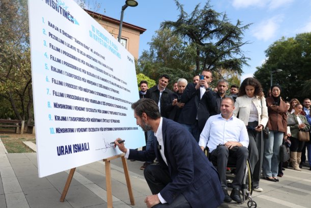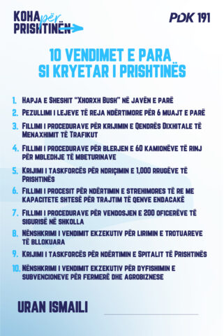 Kandidati i Partisë Demokratike të Kosovës për kryetar të Prishtinës, Uran Ismaili, e ka hedhur sot nënshkrimin në një tabelë me 10 vendime, që premtoi sot se do t’i marrë posa të ulet në karrigen e të parit të kryeqytetit.
