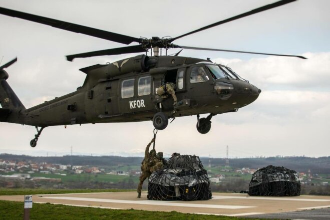 Ushtarët amerikan dhe letonez të misionit të KFOR-it, së fundmi u bashkuan për stërvitjen e operacioneve të ngarkesës me hobe ditën dhe natën.