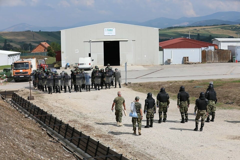 Ushtarët grekë nga Batalioni i 2-të i Forcave Rezervë Operacionale Shumëkombëshe kryen një stërvitje stërvitore për Kontrollin e Trazirave të Turmave dhe Heqjen e Pengesave në kampin Novo Selo.