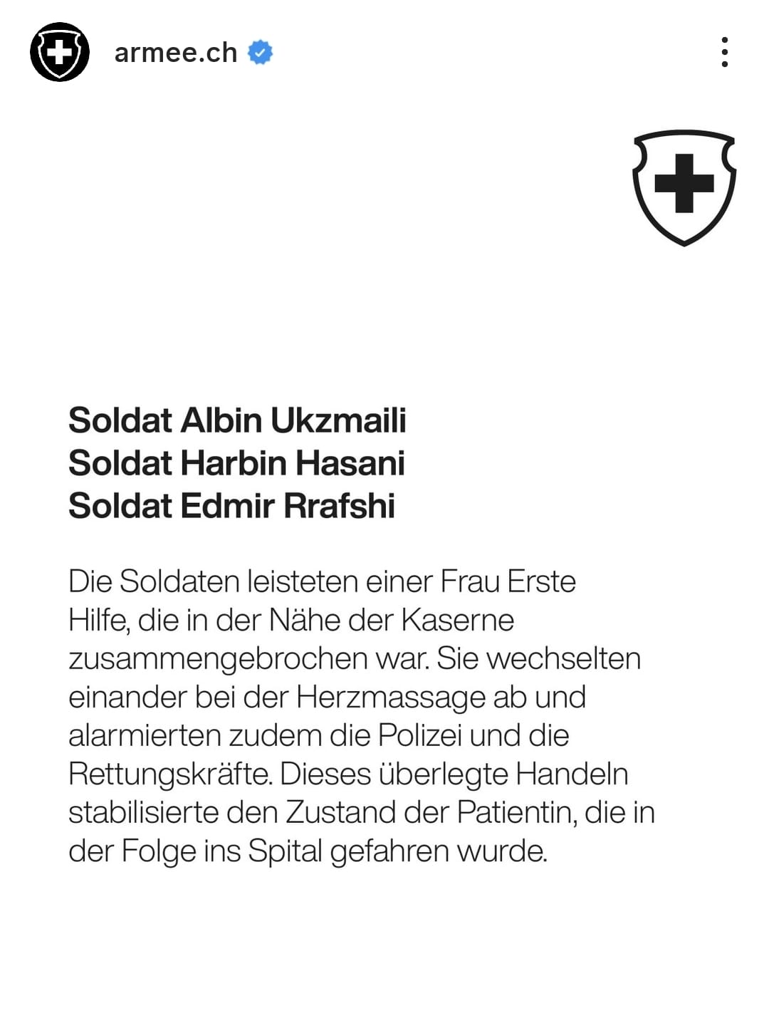 Gazetari Enver Robelli ka publikuar njoftimin e Armatës zvicerane për dekorimin e ushtarëve Albin Ukzmaili, Harbin Hasani e Edmir Rrafshi.