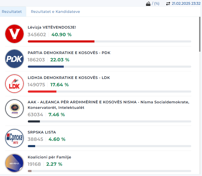 Sipas të dhënave të përditësuar në orën 23:48 në faqen e KQZ-së, janë numruar 49.19% e kutiave. Nga këto numrime lëvizja Vetëvendosje ka marr 81.89%, LDK-ja, 7.21, PDK-ja 5.75%, AAK-Nisma, 1.54% dhe Kolaicioni për Familjen ka marr 1.07%.