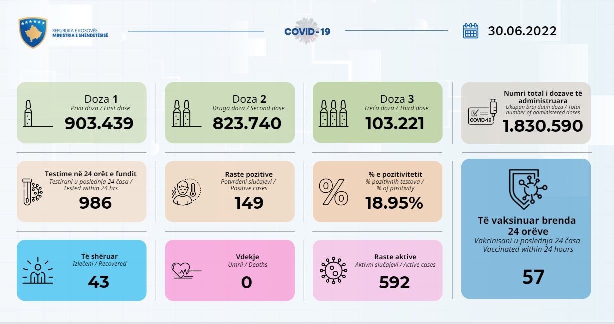 149 raste pozitive kanë rezultuar në 24 orët e fundit, ndërsa 43 pacientë janë shëruar. Numri i rasteve aktive është 592.