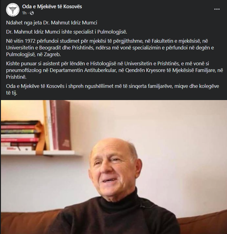 Ka vdekur dr.Mahmut Mumci, i cili ishte ishte specialist i Pulmologjisë.