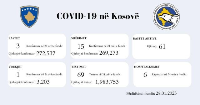 Gjatë 24 orëve të fundit janë regjistruar edhe tri raste të reja, ndërkaq janë shëruar edhe 15 pacientë.