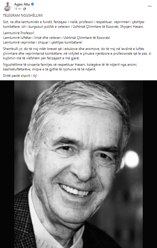 “Shembulli yt, do të rroj ndër brezat që i edukove dhe arsimove, do të rroj në lavdinë e luftës çlirimtare dhe veprimtarisë kombëtare, në virtytet e çmuara njerëzore e profesionale që le pas, si kujtimin më të vlefshëm për ferizajasit e më gjerë”, shkruan Aliu në Facebook. /arbresh.info/