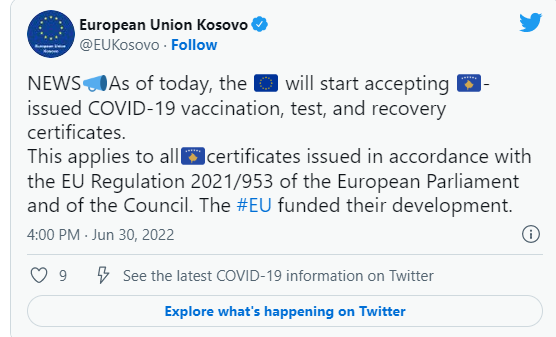 “Nga sot, BE-ja do të fillojë të pranojë certifikatat e vaksinimit, testit dhe shërimit të COVID-19 të lëshuara nga Kosova. Kjo vlen për të gjitha certifikatat e lëshuara në përputhje me rregulloren e BE-së 2021/953 të Parlamentit Evropian dhe Këshillit. BE-ja ka financuar zhvillimin e tyre”, thuhet në njoftim./arbresh.info/