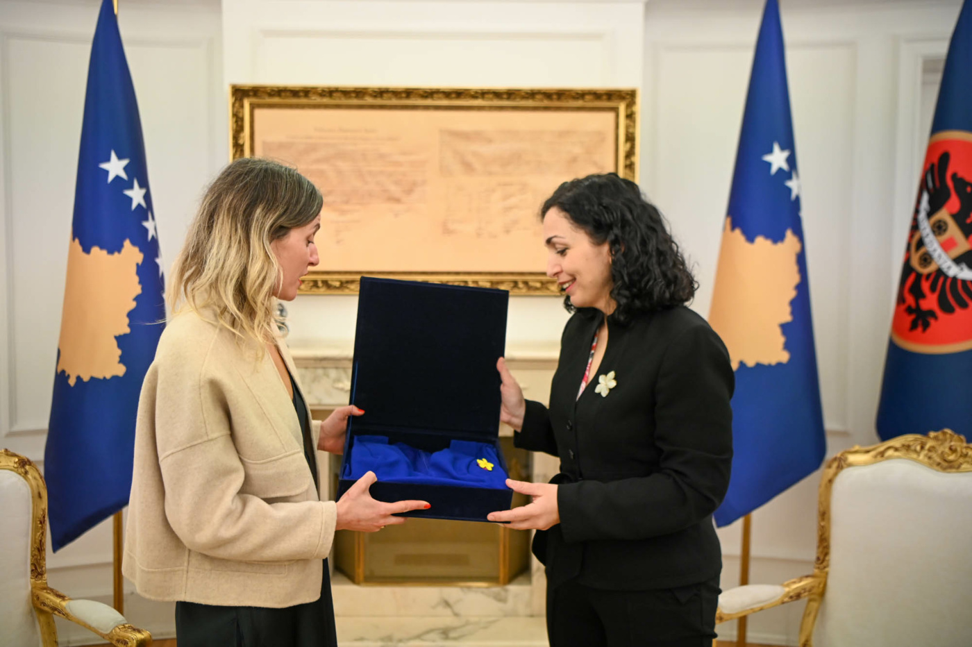 “Në 27 vende të botës, 4 kontinente, tashmë në një dimenzion global, rikthehet vepra artistike e Alketa Xhafa Mripes “Mendoj për ty”. Sot ia dorëzova Alketës fustanin e parë që do të jetë pjesë e këtij instalacioni. Një fustan me ngjyrat e Kosovës e me lulen anemone e cila tashmë është shndërruar në simbol të forcës, guximit e shpresës”, ka shkruar Osmani në Instagram.