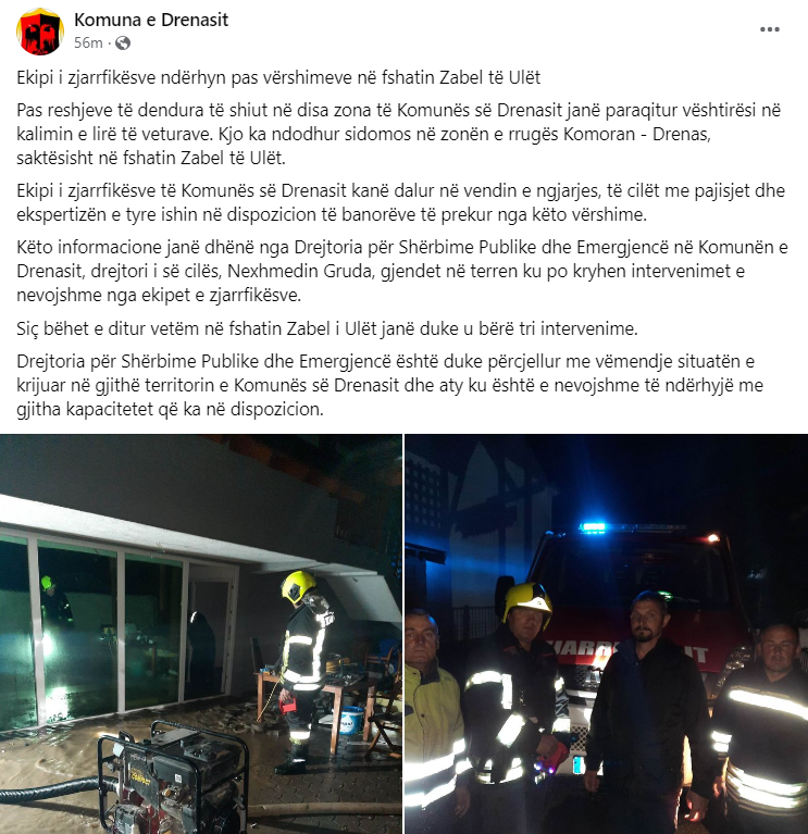 “Këto informacione janë dhënë nga Drejtoria për Shërbime Publike dhe Emergjencë në Komunën e Drenasit, drejtori i së cilës, Nexhmedin Gruda, gjendet në terren ku po kryhen intervenimet e nevojshme nga ekipet e zjarrfikësve. Siç bëhet e ditur vetëm në fshatin Zabel i Ulët janë duke u bërë tri intervenime” njofton komuna e Drenasit.