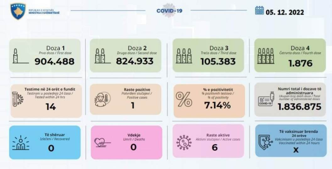Ministria e Shëndetësisë ka njoftuar se gjatë 24 orëve të fundit pas 14 testimeve të bëra vetëm një person ka rezoltuar pozitiv me COVID-19.