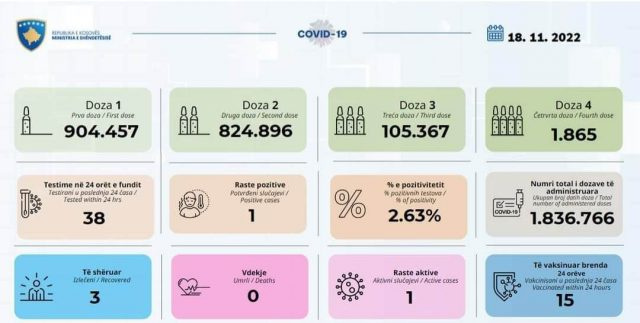 Ministria e Shëndetësisë ka njoftuar se gjatë 24 orëve të fundit vetëm një qytetarë ka rezoltuar pozitiv me COVID-19.
