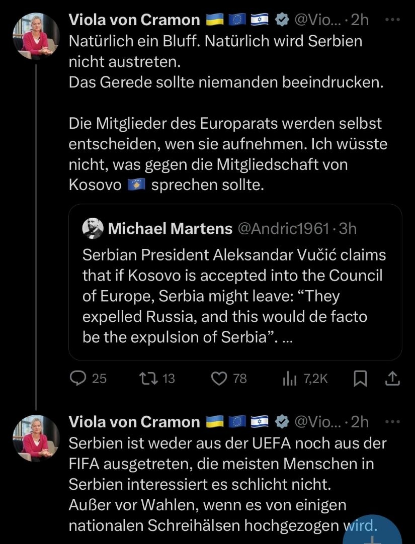 Viola von Cramon, përmes një postimi në “X”, shkruan se sigurisht që Serbia nuk do të largohet nga kjo organizatë.