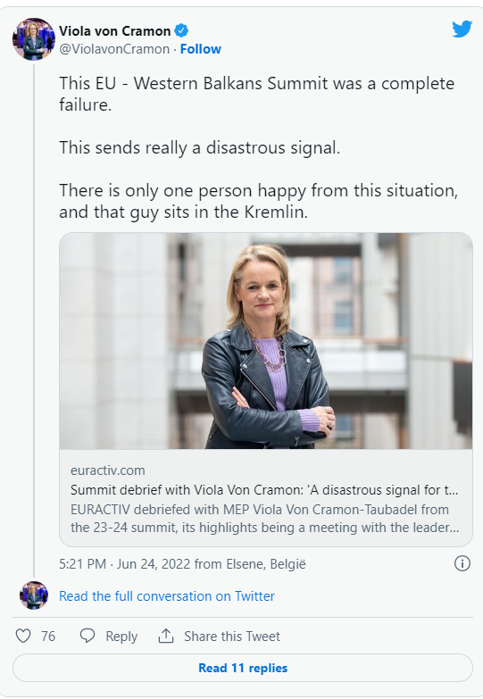“Ky samit BE-Ballkani perëndimor ishte dështim i plotë. Kjo dërgon një sinjal vërtetë katastrofik. Është vetëm një person i lumtur në këtë situatë dhe ai ulet në Kremlin”, ka shkruar Viola von Cramon në Twitter.