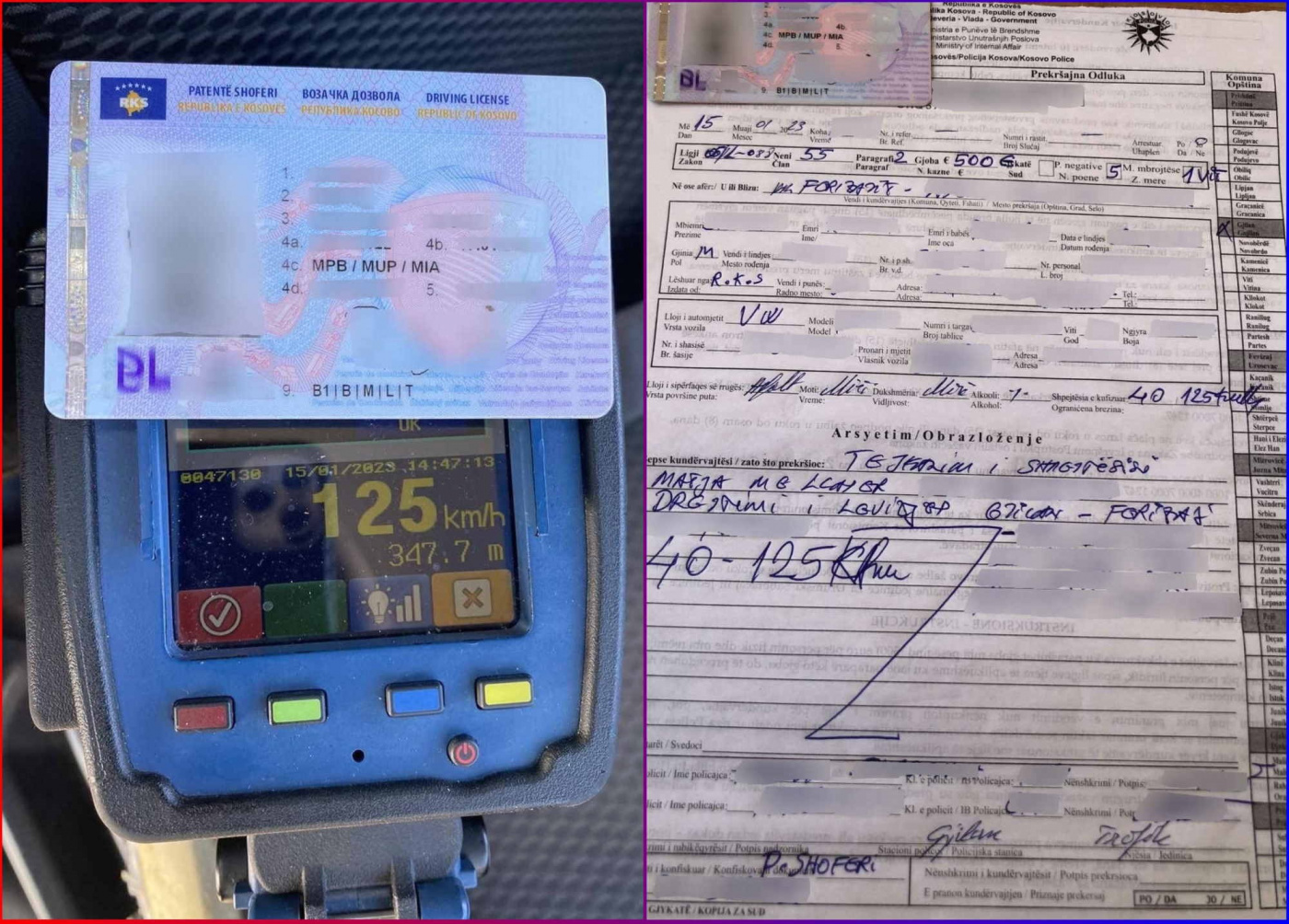 “Në këtë pikë të kontrollit ka hasur në një kundërvajtës i në zonën ku kufizimi i shpejtësisë së lejuar është dyzet (40) km/h duke vozitur me shpejtësinë njëqind e njëzet e pesë (125) km/h. Të njëjtit i është shqiptuar gjoba në vlerë prej pesëqind (500) eurove, konfiskuar patentë shoferi me masa e përkohshëm e ndalim vozitjes në afat prej një (1) viti dhe pesë (5) pikë negative”, bën të ditur policia.