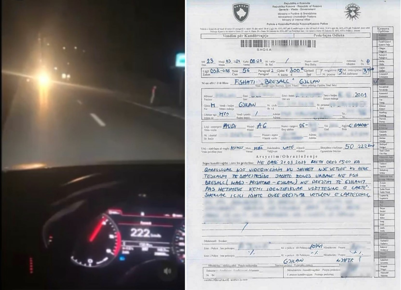 Njësiti rajonale i trafikut rrugor Gjilan, njofton se kanë identifikuar personin i cili në rrjetet sociale ka publikuar një video ku shihet duke vozitur 222 km/h në zonën e kufizimit 50 km/h në fshatin Bresalc, aksi rrugorë Prishtinë-Gjilan.