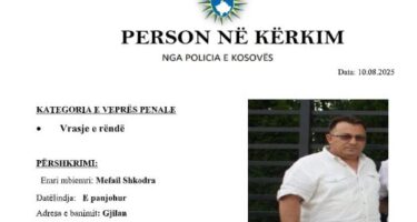 Policia e Kosovës ka kërkuar bashkëpunim me qytetarët për gjetjen dhe arrestimin e Mefail Shkodra, i dyshuar për vrasjen e dyfishtë në Gjilan, dhe plagosjen e dy të tjerëve. “Policia e Kosovës, Drejtoria Rajonale e Policisë në Gjilan, bazuar në autorizimin e Prokurorisë Themelore në Gjilan, me qëllim të lokalizimin dhe arrestimin e të dyshuarit, … Continue reading Vrasja e dyfishtë në Gjilan, policia shpall në kërkim Mefail Shkodrën