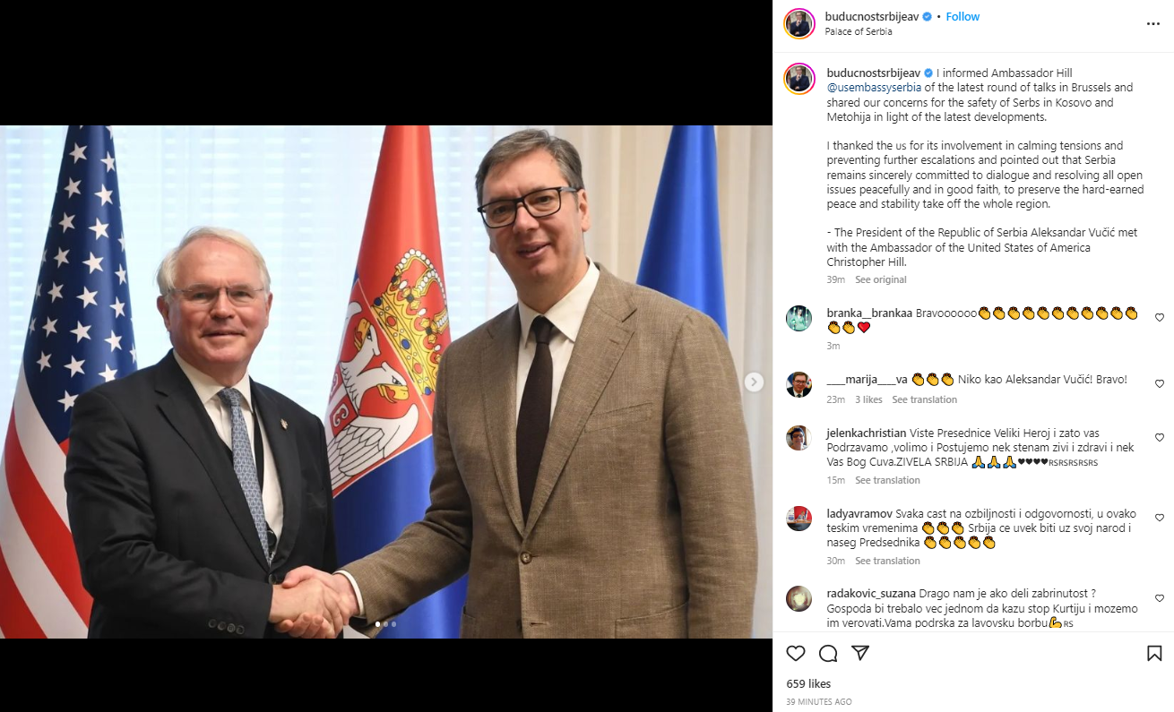 “E informova ambasadorin amerikan në Serbi, Christopher Hill, për raundin e fundit të bisedimeve në Bruksel dhe ndava shqetësimin tonë për sigurinë e serbëve në Kosovë në dritën e zhvillimeve të fundit”, ka thënë Vuçiq në profilin e buducnostsrbijeav në Instagram.