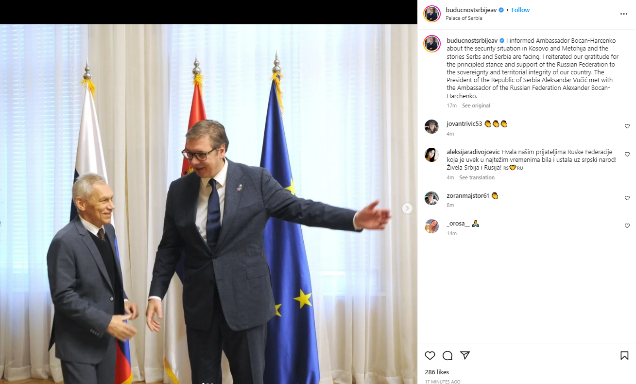 “Faleminderit për ftesën dhe që më dhatë mundësinë t’ju informoj për situatën në të cilën ndodhet Serbia. Ne nuk heqim dorë nga politika e përgjegjshme e paqes dhe stabilitetit”, tha Vuçiq pas seancës, një profilin e tij në Instagram.