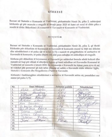 Lëvizja Vetëvendosje në Vushtrri ka nisur procedurat për shkarkimin e kryesues së Kuvendit Komunal të kësaj komunë.