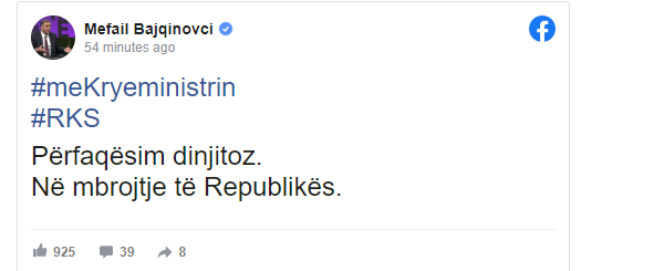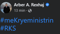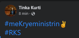 Zëdhënësi i VV-së, Arlind Manxhuka, deputetët e kësaj partie, Mefafil Bajqinovci, Arbër Rexhaj dhe Tinka Kurti kanë postuar në Facebook hashtag-un #mekryeministrin dhe #RKS.