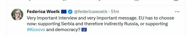 Federica Woelk, aistente e akredituar e Parlamentit Europian, ka shkruar sot në ‘Twitter’, rreth zhvillimeve të fundit në rajon.