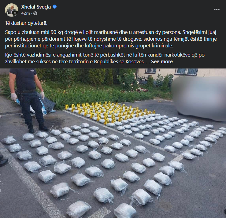 “Sapo u zbuluan mbi 90 kg drogë e llojit marihuanë dhe u arrestuan dy persona. Shqetësimi juaj për përhapjen e përdorimit të llojeve të ndryshme të drogave, sidomos nga fëmijët është thirrje për institucionet që të punojnë dhe luftojnë pakompromis grupet kriminale. Kjo është vazhdimësi e angazhimit tonë të përbashkët në luftën kundër narkotikëve që po zhvillohet me sukses në tërë territorin e Republikës së Kosovës”, ka shkruar Sveçla.