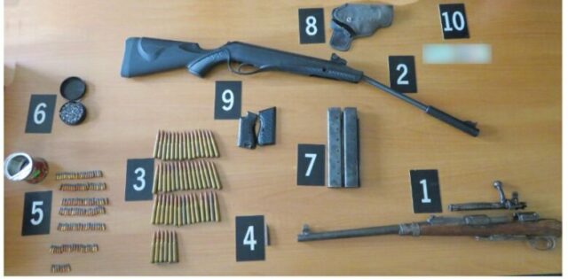Sipas njoftimit të policisë, gjatë kontrollit të kryer me urdhër të Gjykatës Themelore, në shtëpinë dhe objektet përcjellëse të të dyshuarit janë gjetur dhe sekuestruar si prova për gjykatën: Një (1) pushkë gjuetie e llojit BOLT A RIFLE, një (1) pushkë ajrore e llojit RETAY 70S, pesëdhjetë e një (51) copë fishekë të kalibrit 7.9 mm, një (1) fishek i kalibrit 7.62 X 39 mm, një (1) kuti me njëqind e njëzet e shtatë (127) copë fishekë të kalibrit 22LR, një (1) kuti me diabolla të pushkës ajrore, dy (2) karikatorë të pushkës së gjatë, një (1) fotrollë e pistoletës, dy (2) doreza të pistoletës.