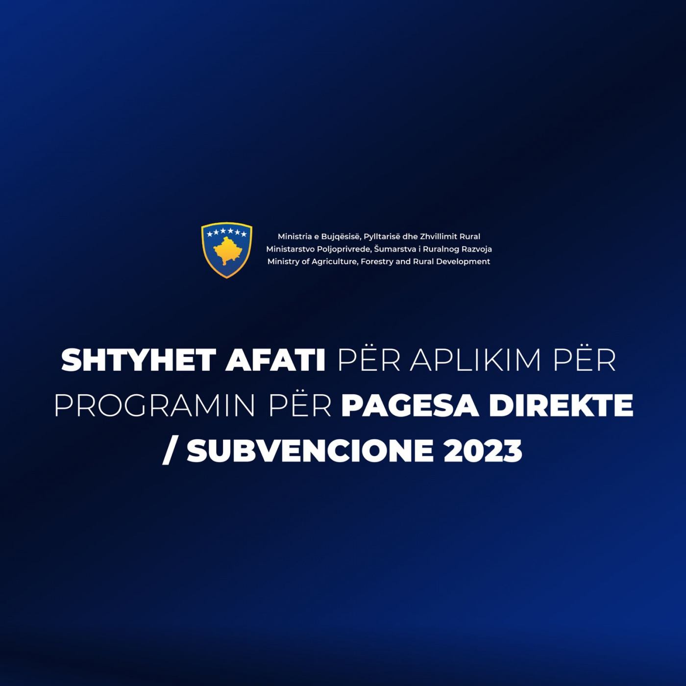 Ministria e Bujqësisë, Pylltarisë dhe Zhvillimit Rural ka marrë vendim për zgjatjen e afatit për aplikim për pagesa direkte/subvencione për kulturat bujqësore për vitin 2023, nga data 30 mars deri me 06 prill 2023 në ora 16:00.