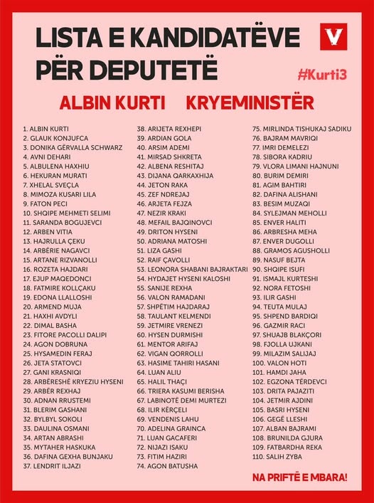 Pas dorëzimit të listës në KQZ, Lëvizja Vetëvendosje ka publikuar emrat e kandidatëve të saj për deputet të Kuvendit të Kosovës në zgjedhjet që do të mbahen më 9 shkurt./Arbresh.info