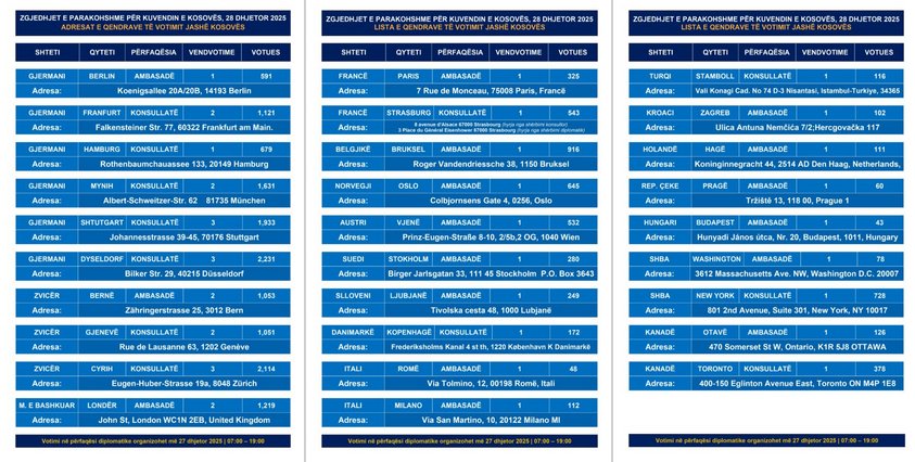 Procesi i votimit do të zhvillohet në 40 vendvotime që u përkasin 16 ambasadave dhe 13 konsullatave të Republikës së Kosovës, të cilat janë të vendosura në 18 shtete të ndryshme.