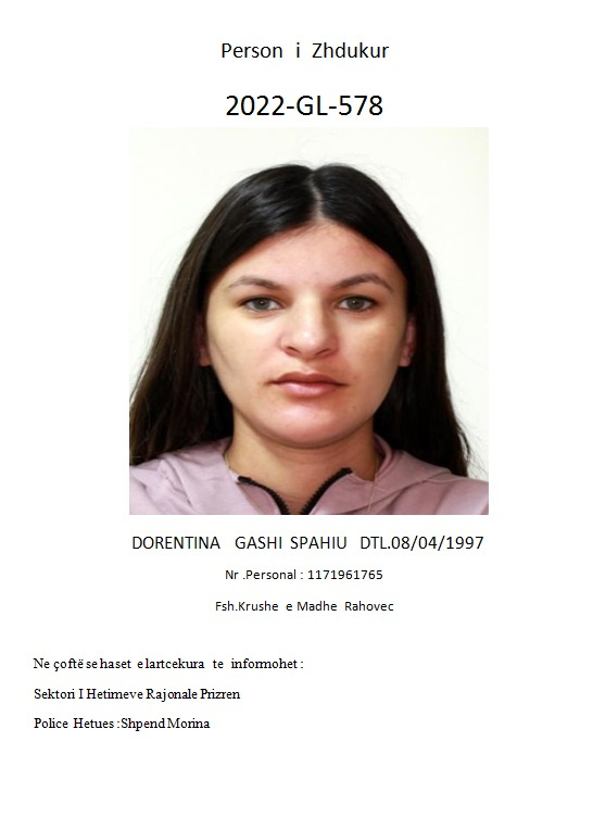 “Personi i raportuar i zhdukur Dorentina ( Vllaznim ) Gashi – Spahiu ,dtl.08.04.1997, me date 09.11.2022 02:00 është larguar pa asnjë paralajmërim nga shtëpia e saje e banimit ne Lagjen Arbane dhe deri ne këto momente nuk ka asnjë informate lidhur me fatin dhe vendndodhjen e saj”, thuhet në njoftim.