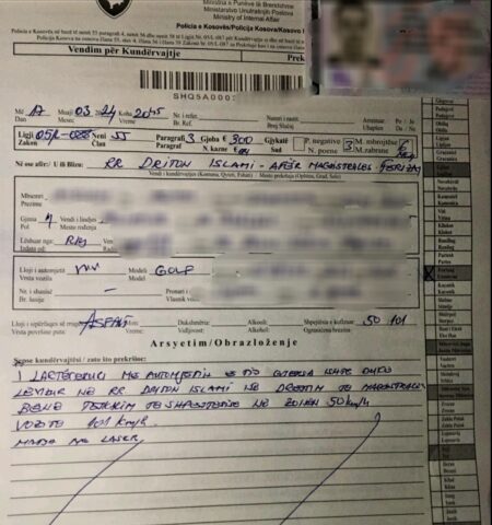 Policia Rajonale e Komunikacionit Rrugor me datën 17.03.2024 rreth orës 20:45 në rrugën “Driton Islami” në Ferizaj ka ndaluar shoferin A.A (M/K) i moshës 21 vjeçar, i cili ka bërë tejkalimin e shpejtësisë, ku në zonën e kufizimit 50 km/h ka zhvilluar shpejtësi 101 km/h.