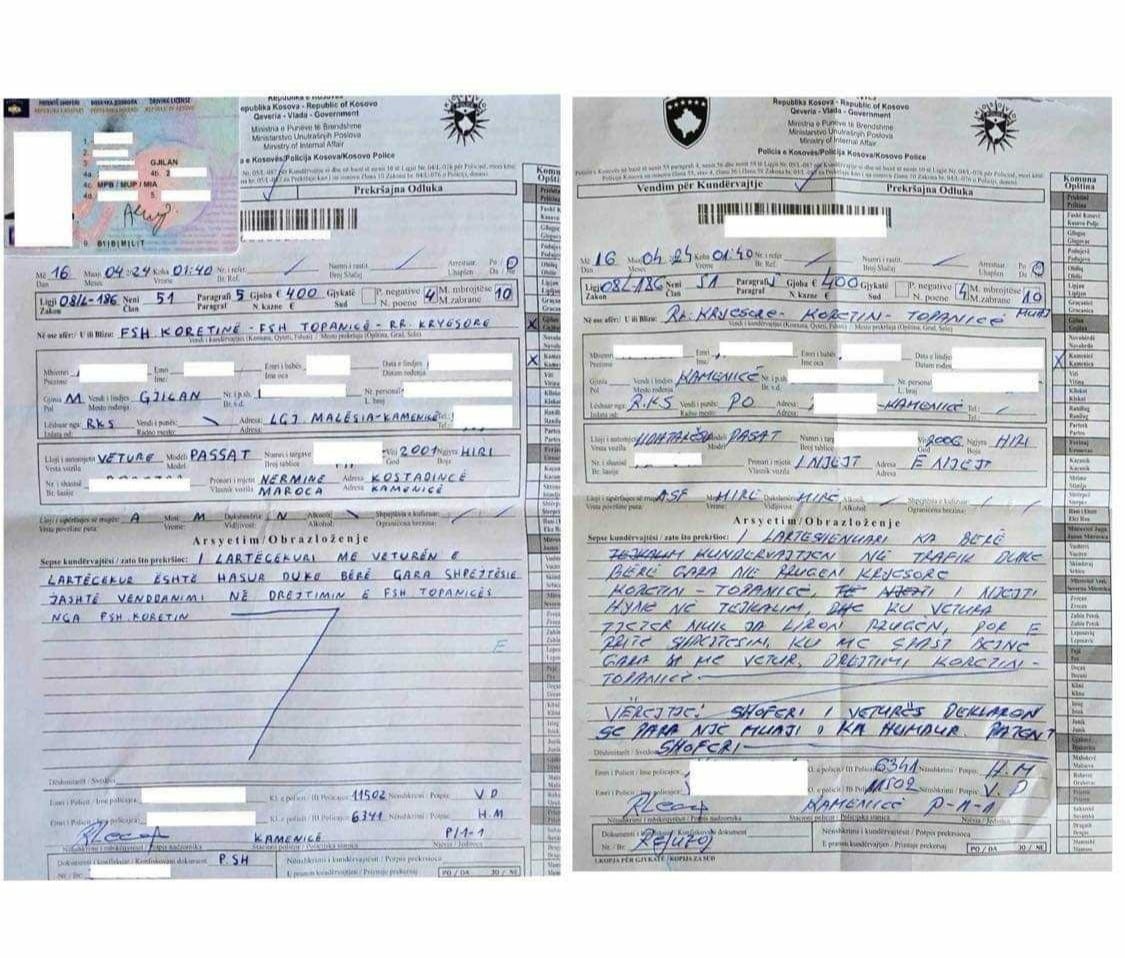 “Të njëjtëve konform ligjit për rregullat në trafikun rrugor 08/L- 186 neni 51 paragrafi 5 u janë shqiptuar gjoba në vlerë prej katërqind (400) euro, katër (4) pikë negative dhe masën e përkohshme të ndalim vozitjes së mjeteve motorike në afat prej dhjetë (10) muaj”, njofton policia.