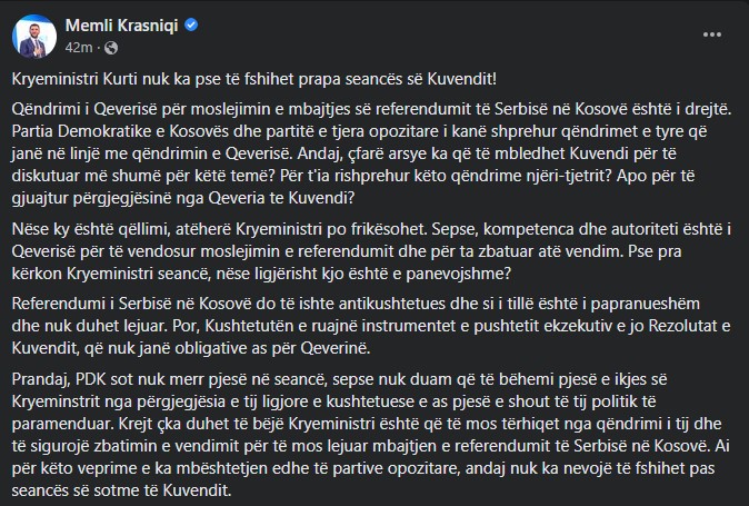 Kryetari i Partisë Demokratike të Kosovës, Memli Krasniqi ka thënë se PDK-ja nuk do të marrë pjesë në seancën e jashtëzakonshme të thirrur nga kryeministri Kurti, pasi “nuk duam që të bëhemi pjesë e ikjes së Kryeministrit nga përgjegjësia e tij ligjore e kushtetuese e as pjesë e shout të tij politik të paramenduar”, raporton arbresh.info.