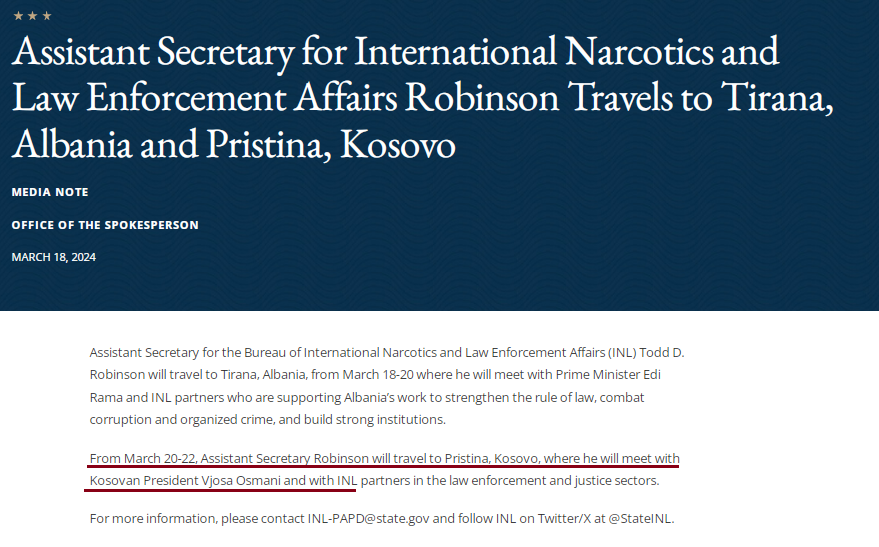 “Nga data 20-22 mars, Ndihmës Sekretari Robinson do të udhëtojë në Prishtinë, Kosovë, ku do të takohet me Presidenten e Kosovës Vjosa Osmani dhe me partnerët e INL-së në sektorin e zbatimit të ligjit dhe drejtësisë”, thuhet në njoftim.