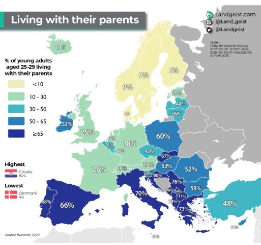 “Landgeist” është një uebfaqe që mbledh dhe analizon statistikat nga shtete të ndryshme në gjithë botën. Sipas të dhënave që ka marrë nga “Eurostati” në shumicën e vendeve nga viti 2020, kjo uebfaqe ka përpiluar listën e popujve evropianë se sa jetojnë të rinjtë, në moshën 25-29-vjeçare, me prindërit e tyre.