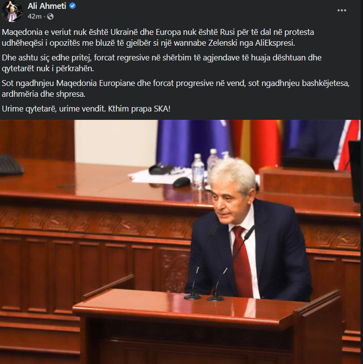 “Maqedonia e veriut nuk është Ukrainë dhe Europa nuk është Rusi për të dal në protesta udhëheqësi i opozitës me bluzë të gjelbër si një wannabe Zelenski nga AliEkspresi. Dhe ashtu siç edhe pritej, forcat regresive në shërbim të agjendave të huaja dështuan dhe qytetarët nuk i përkrahën. Sot ngadhnjeu Maqedonia Europiane dhe forcat progresive në vend, sot ngadhnjeu bashkëjetesa, ardhmëria dhe shpresa. Urime qytetarë, urime vendit. Kthim prapa SKA! ”, shkruan Ahmeti./arbresh.info/