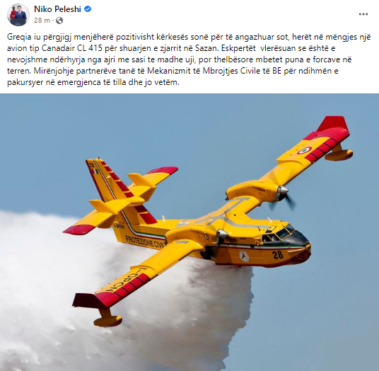 Në një postim në Facebook, Peleshi ka bërë të ditur se shteti grek ka angazhuar sot, herët në mëngjes një avion tip Canadair CL 415 për shuarjen e zjarrit në Sazan.