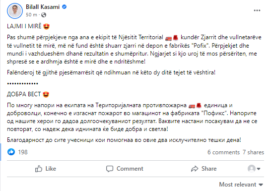 “Pas shumë përpjekjeve nga ana e ekipit të Njësitit Territorial kundër Zjarrit dhe vullnetarëve të vullnetit të mirë, më në fund është shuarr zjarri në depon e fabrikës “Pofix””.