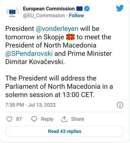 Komisioni Evropian njoftoi se nesër, kryetarja Ursula von der Leyen do të takohet me “presidentin e Maqedonisë së Veriut” Stevo Pendarovski dhe do t’i drejtohet “parlamentit të Maqedonisë së Veriut”, pas së cilës nuk shkoi shumë kohë dhe e larguan postimin nga Twitter për ta zëvendësuar me një njoftim të ri.