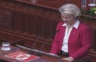 - Deputetët e opozitës maqedonase me pankarta ‘Jo’ gjatë fjalimit të Ursula von der Leyen
