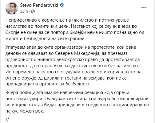 “U bëj apel të gjithë organizatorëve të protestave, të cilat po mbahen këto ditë në Maqedoninë e Veriut të ndërmarrin përgjegjësi dhe të drejtën e tyre demokratike që të protestojnë të vazhdojnë ta praktikojnë me dinjitet dhe pa dhunë. Njëkohësisht e gjykoj rreptësishtë mbajtjen dhe përdorimin e armës së zjarrit nga civilët dhe qytetarët në vend, të cilët nuk janë përfaqësues të organeve të sigurisë. Dje policia kishte një reagim në kohë i cili parandaloi përplasje më të mëdha. Pres që të gjithë personat të cilët u involuan mbrëmë në këtë incident të arrestohen dhe të sanksionohen përkatësisht në afatin sa më të shkurtër të mundshëm”, ka shkruar mes tjerash Pendarovski.