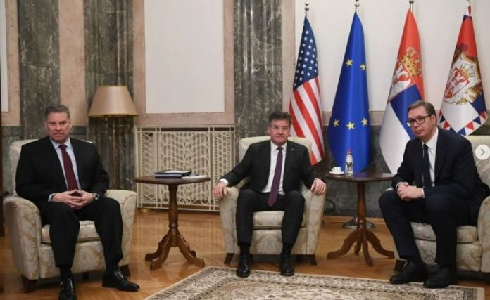 Më shumë se dy orë e gjysmë zgjati takimi tripalësh mes Presidentit të Serbisë, Aleksandar Vuçiç, Zv/Ndihmës Sekretarit amerikan të Shtetit, Gabriel Escobar, dhe Fascilituesit të BE’së për Dialogun Kosovë-Serbi, Miroslav Lajçak, raporton gazeta online Reporteri.net.
