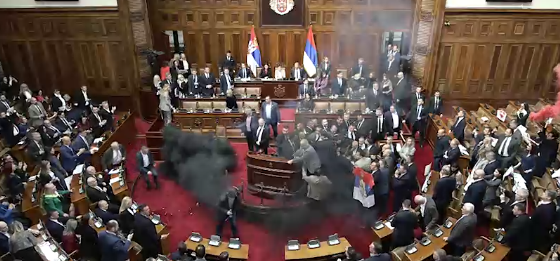 Gjatë mbledhjes së Kuvendit të Serbisë të martën, ka pasur përplasje fizike, tym, gaz lotsjellës dhe flakë.