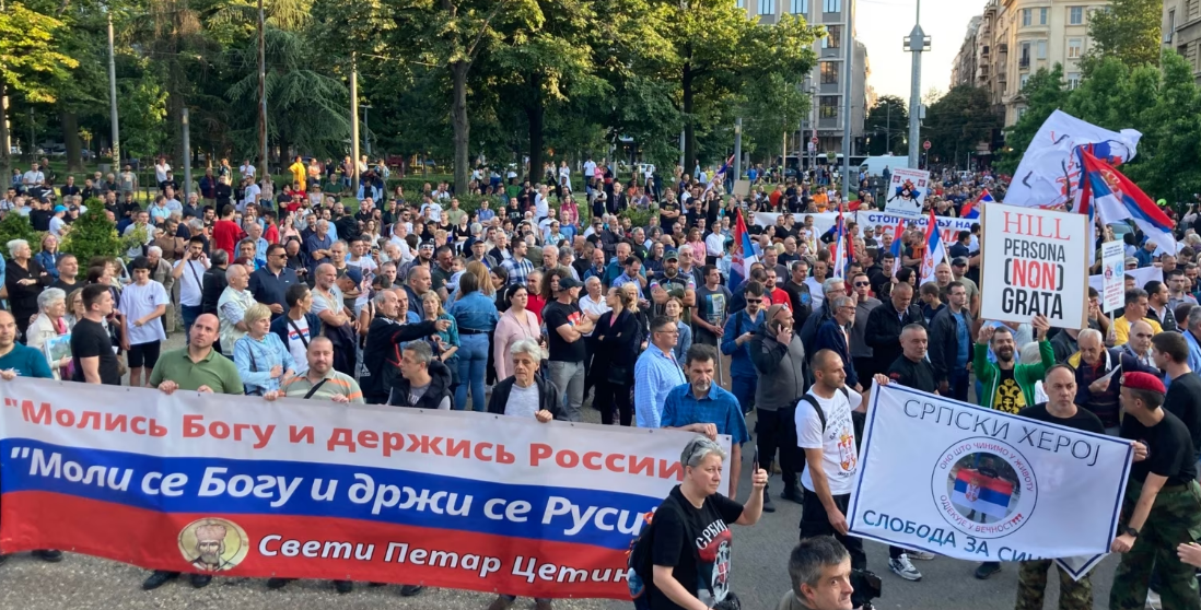 Në tubim u dëgjuan këngë nacionaliste për Kosovën dhe u shpalos pankarta: “Stop terrorit ndaj serbëve në Kosovë e Metohi”.