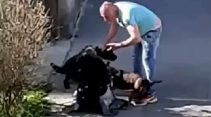 Ndonëse kafshët u ndanë shpejt, burri në video nuk ndaloi së sulmuari verbalisht dhe fizikisht gruan. /Telegrafi/