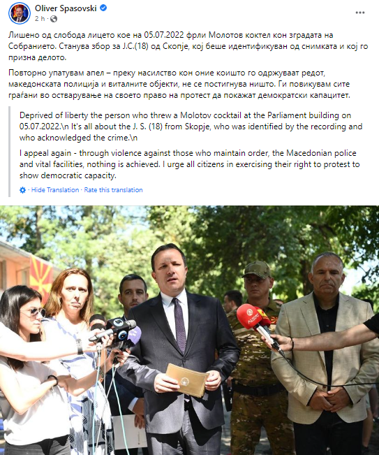 “Do të shihni se policia e parandaloi incidentin, edhe atë një numër i madh i zyrtarëve policorë, shihni videot që janë publikuar edhe nga mediumet edhe nga ne. Ja po u’a tregoj vetëm një fotografi, a nuk është kjo diçka ku intervenohet në vendin e ngjarjes?”, tha mes tjerash Spasovski.