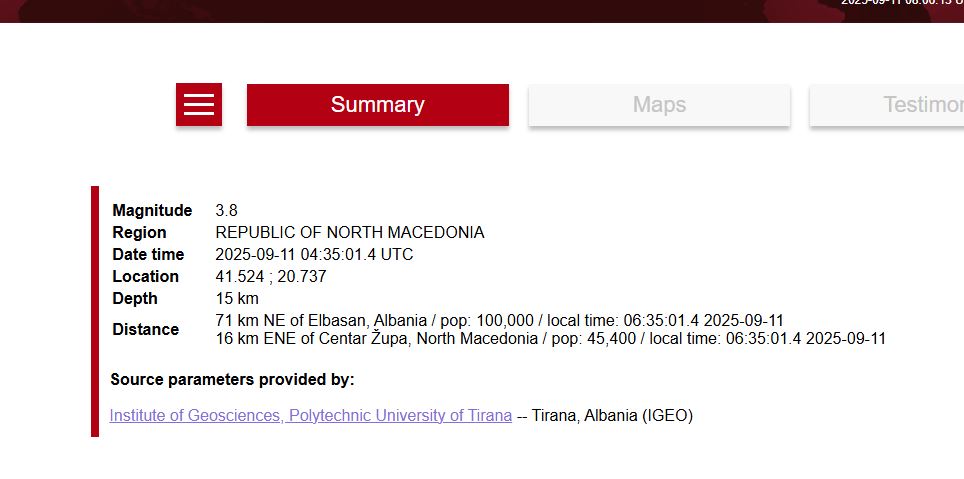 Një tërmet prej 3.8 shkallë të Rihterit është regjistruar në orët e hershme të mëngjesit të sotëm në Maqedoninë e Veriut.