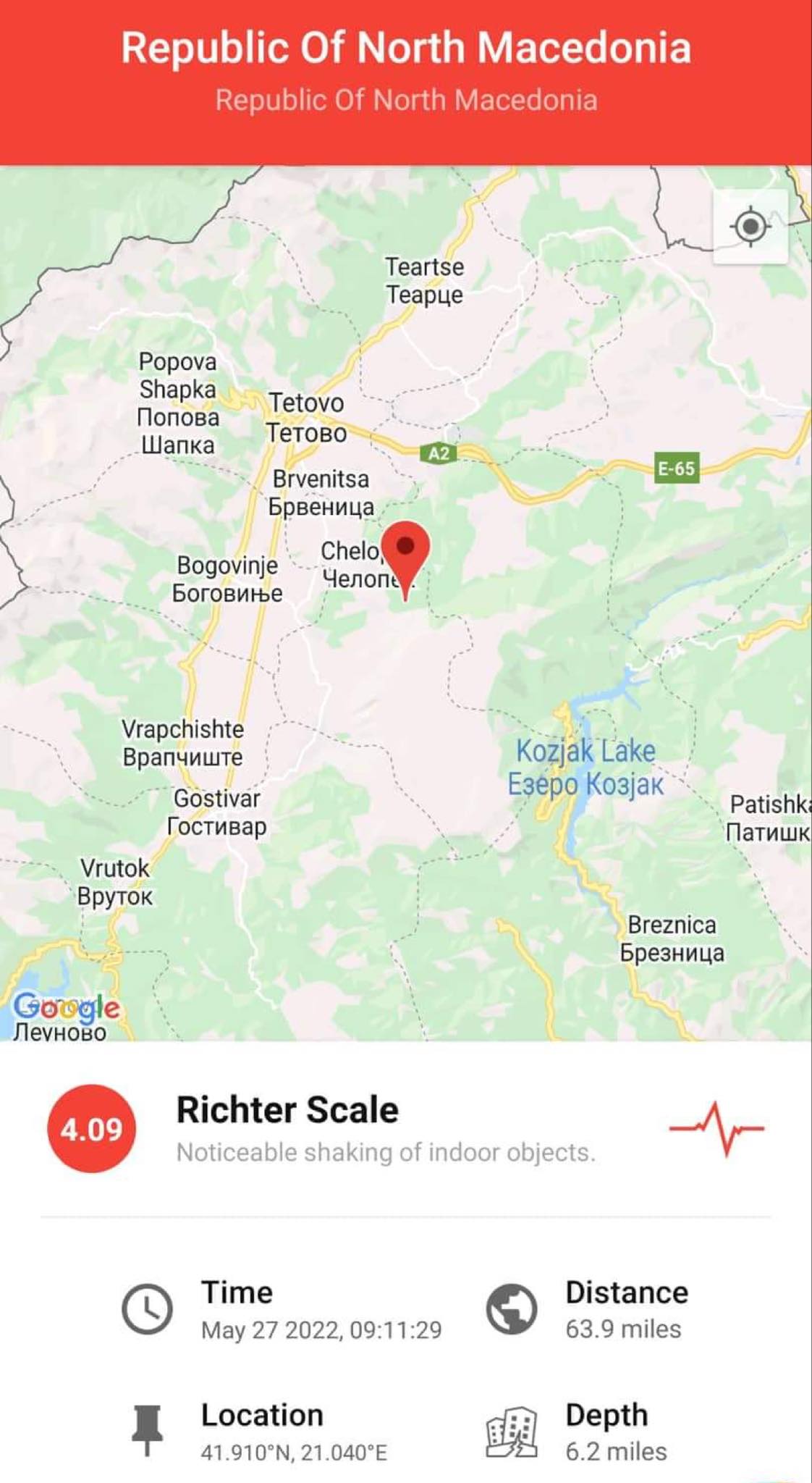 Sot në orën 09:11 është ndjerë tërmet në Maqedoninë e Veriut.