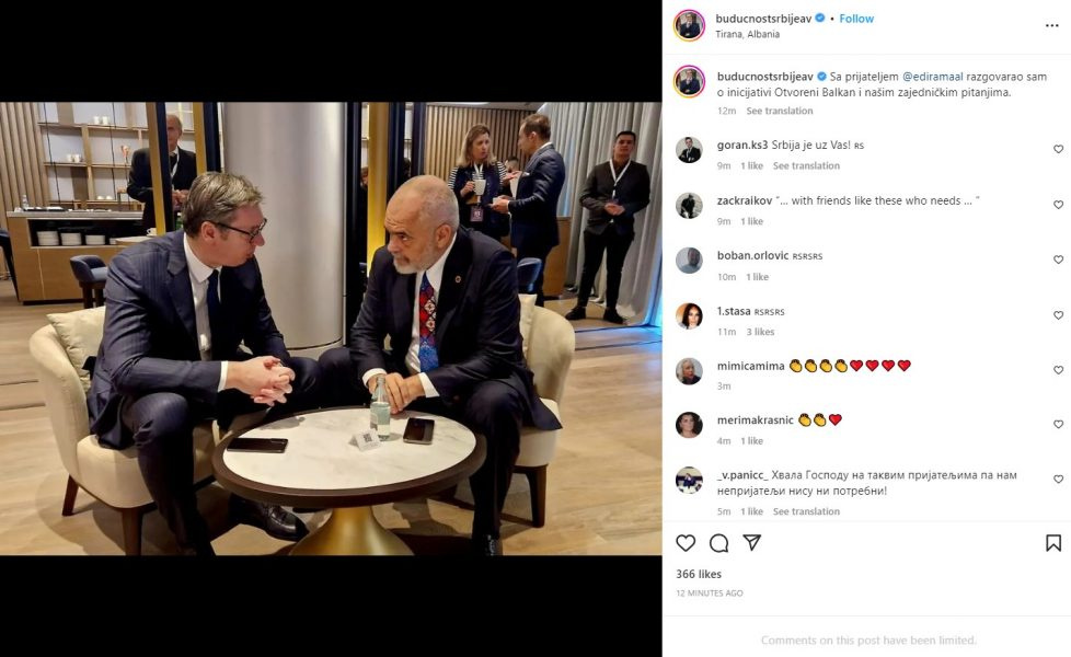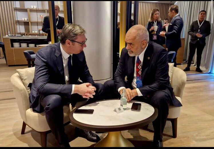 Dyshja shihen të ulur në një tavolinë duke biseduar me njëri-tjetrin, meqë rast Vuçiq e quajti mik Ramën.