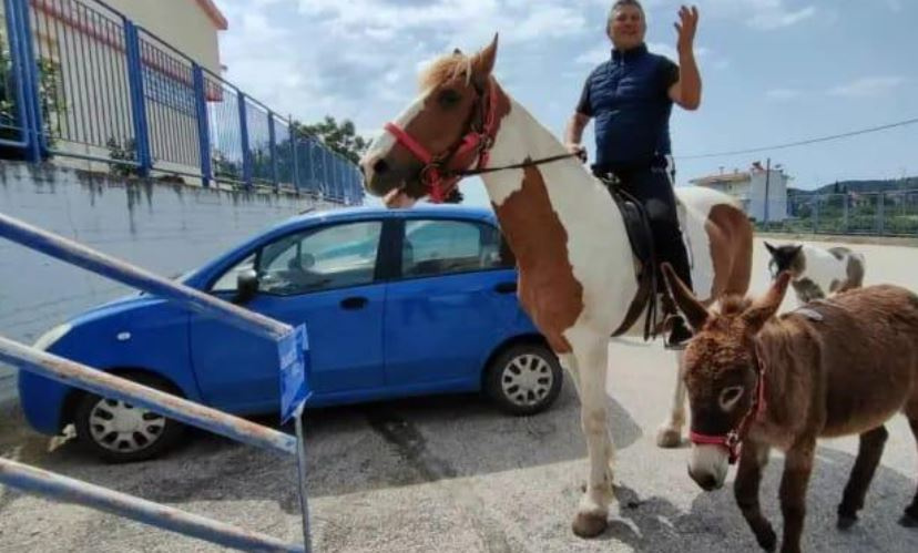 Një fermer është shfaqur në një qendër votimi në Nafplion së bashku me kalë dhe me gomar, shkruan Euronews.al.